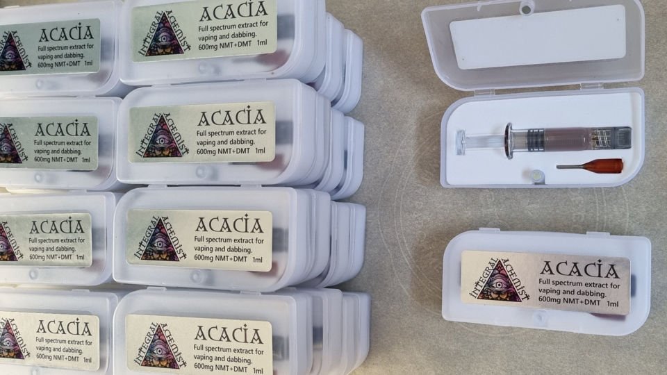 600mg of n-n-dimethyltryptamine and n-methyltryptamine extracted from acacia confusa root bark^ in its natural ratio using a non-toxic edible essential oil instead of the commonly used naphth a hydrocarbon, so nothing in the juice is toxic.